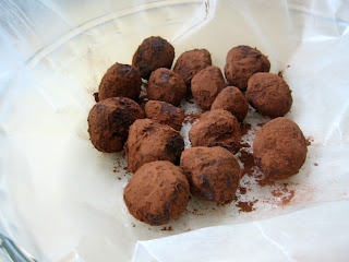 I used this cardamom truffle recipe and substituted lavender for the cardamom. Then today I made a batch with orange zest and a little triple sec. They taste great, especially the lavender ones, though I don't quite have the hang of getting them into a round shape--I tried a regular spoon, I tried a melon baller, I tried a very half-spherical tea spoon but only got a few with a reasonable curve to them. So mine are "rustic" if you are feeling nice, and "lumpy" if you aren't feeling so nice.